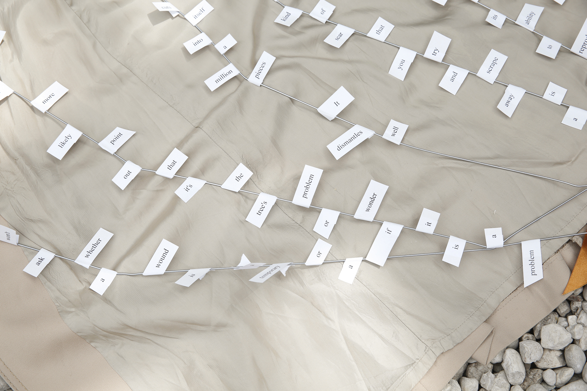 Aodhan Madden, Stage for St Martin (universal foliage), 2019 Beige coat, coat hangers, ribbon, labels
